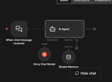 Le premier nœud que nous allons sélectionner est le « Chat Trigger », qui permet d’interagir avec le modèle d’IA. Par la suite, il sera possible de le remplacer par un autre nœud afin de récupérer des données provenant d’une source différente.
