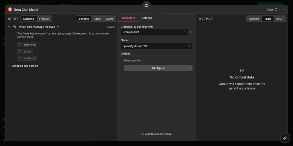Pour que l’agent d’IA soit pleinement fonctionnel, il est également nécessaire de configurer le LLM qui va le piloter. Ici, nous ferons le choix du bloc GroqCloud pour ses performances en termes de vitesse et son large choix de modèles de langage.