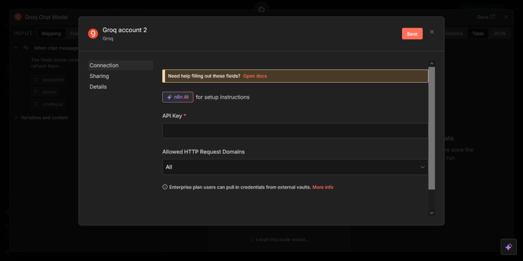 Pour l’utiliser, il faut se rendre sur le site de GroqCloud, créer un compte, puis générer une clé d’API. Cette clé devra ensuite être copiée et collée dans la section « Credentials to connect » > « Create new credential », puis dans le champ « API Key ».