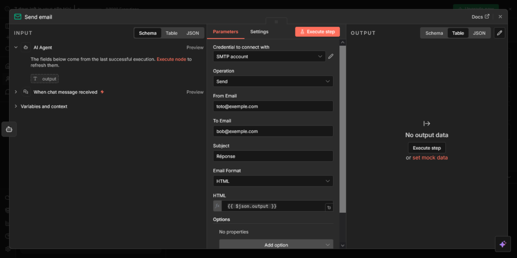 Il faudra ensuite configurer le nœud « Send Email ». Il est fortement conseillé d’utiliser une adresse e-mail qui n’est pas liée à Gmail, afin d’éviter la configuration via l’API Google, qui peut s’avérer plus complexe.