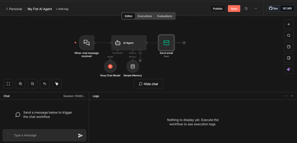 Une fois la configuration de l’e-mail terminée, vous pouvez envoyer un message à l’agent d’IA depuis la fenêtre située en bas à gauche de l’écran.